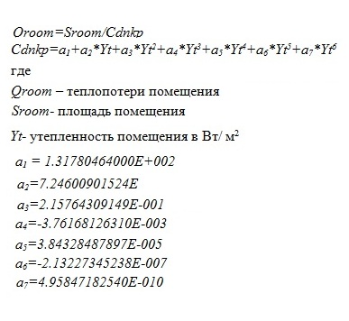 Особой проработки потребовала идея расчета теплообмена слету в пользовательском режиме. Дело в том, что готовых физических формул здесь не было и инженеры для расчетов теплопотерь пользовались таблицами. Для каждого отдельного случая утепленности есть свои табличные значения теплопотерь, зависимые от размеров помещения. Это все дискретные (не непрерывные) величины. Кроме того, таблицы к калькулятору не пришьешь, нужна формула. Итак, есть в наличии дискретные величины утепленности для которых существуют дискретные зависимости теплопотерь от площади помещения. Требуется связать непрерывной функцией теплопотери помещения, его площадь и утепленность. Задачу эту решил, использовав аппроксимацию и разложение в ряды Тейлора. Готовая, работающая формула в приближении до 6 степени включительно такова: