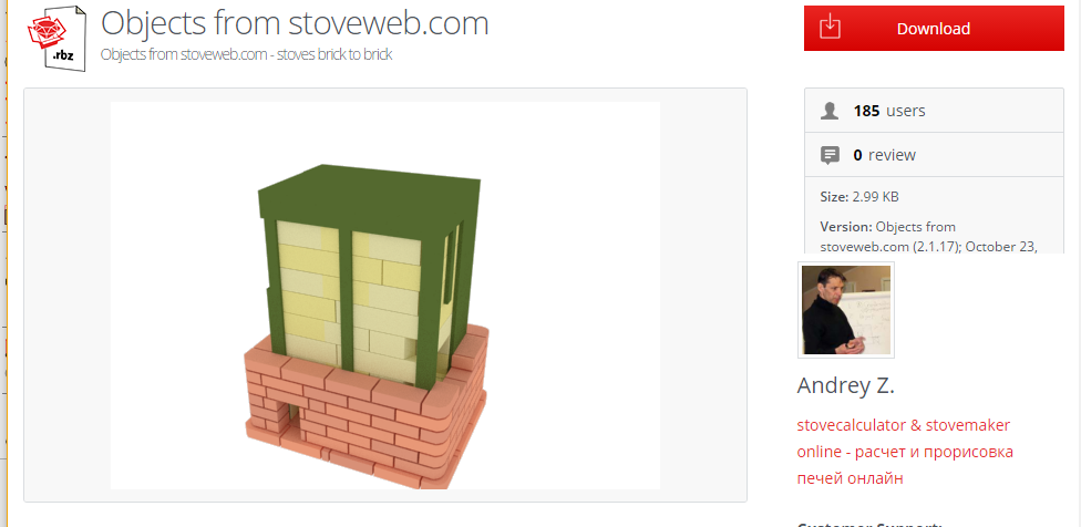 Для универсальности программы не хватало еще одного: нужно было сделать выход на трехмерную графику, чтоб выходной формат предполагал прорисовку проекта в какой-нибудь программе трехмерного моделирования с целью вписывания объекта в интерьер, проработки дизайна, визуализации и выполнения прочих современных фокусов. Выбор пал на программу SketchUp, которая интенсивно развивалась и является, на мой взгляд, самой простой и функциональной в этой сфере сегодня. Я дописал к программе SketchUp расширение, которое бы распознавало файлы, подготовленные обсуждаемым сервисом, и отстраивала бы трехмерную модель. Это небольшое расширение на 3КБ сейчас доступно всем желающим на официальном сайте SketchUp, оно так и называется «объекты от (Objects from) stoveweb.com».