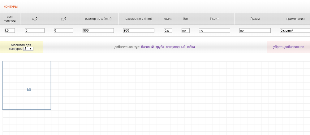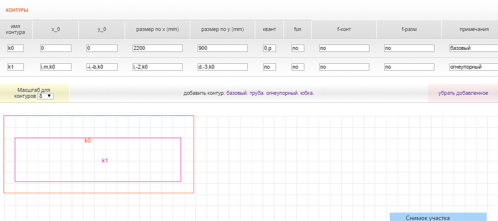 Можно задавать контуры и другим способом, используя гомотетию путем сжимания разжимания любого из уже заданных контуров, при этом достаточно указать сжимаемый контур и указать через запятую размеры, на которые следует его растянуть. Данный способ универсален для любых преобразований контуров: гомотетией можно получить любой прямоугольный контур в любом месте из любого уже существующего. Например, запись 25,25,25,25 будет означать, что контур будет выступать от базового контура на 25 мм во все стороны