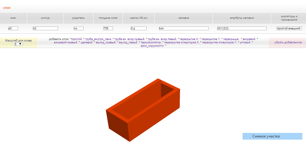 Следующий параграф, «слои», отвечает у нас за высоту того или иного контура и способ заполнения этого контура. Способ заполнения контура определит, каким образом данный контур используется в кладке: сплошным заполнением, заполнением по периметру или заполнением каких-то сторон отдельно, а возможно это будет угловой контур или круговой, или полу арочный, вписанный в изначально заданный прямоугольный контур. Возможно, это будет несколько контуров, сложенных вместе, прорез в сплошном слое, вихревой канал, выпускное хайло и т.д. – все эти и другие особенности кладки данного слоя описываются здесь, так же, как и способ использования материала кладки (ориентация кирпича)